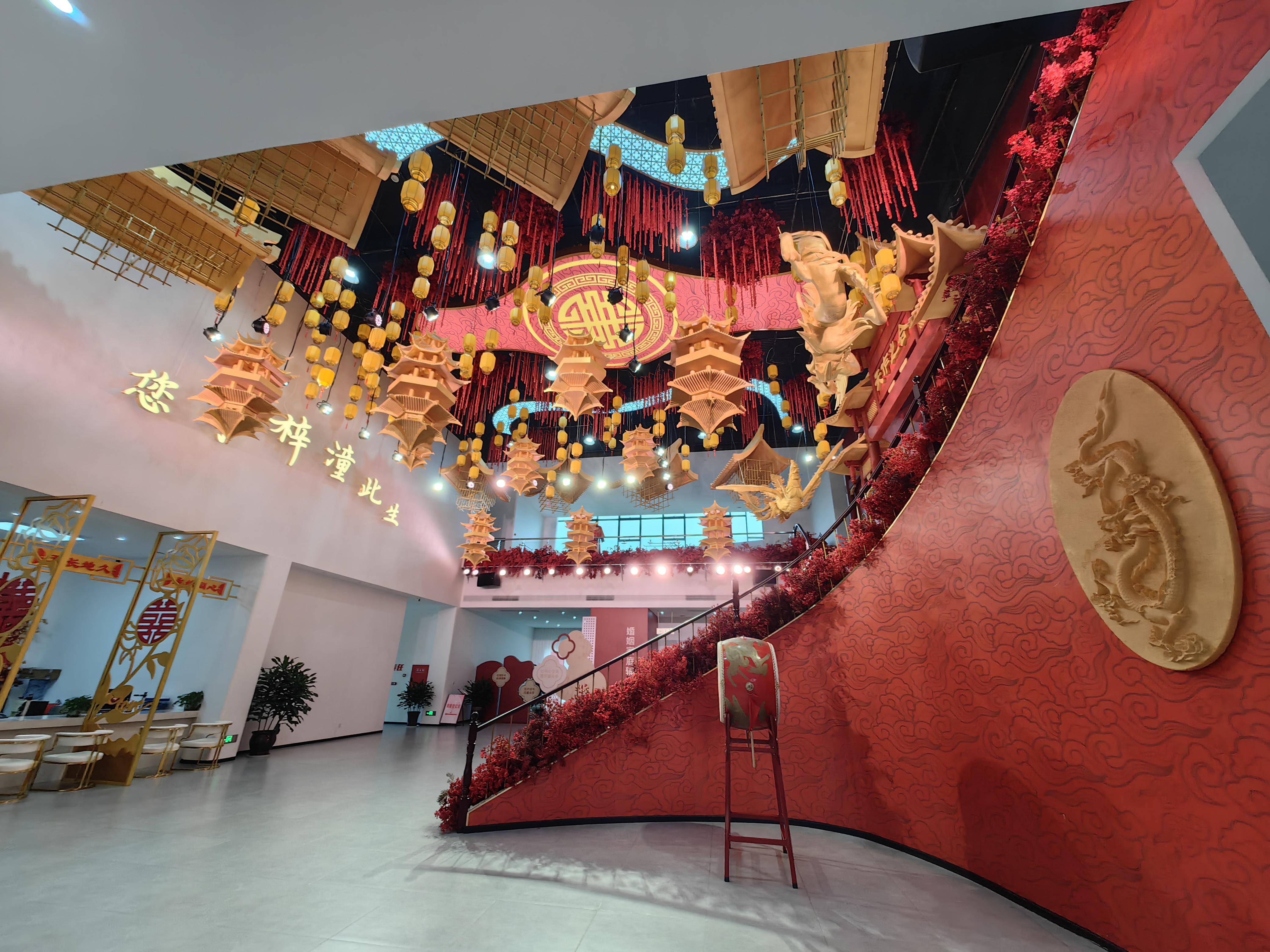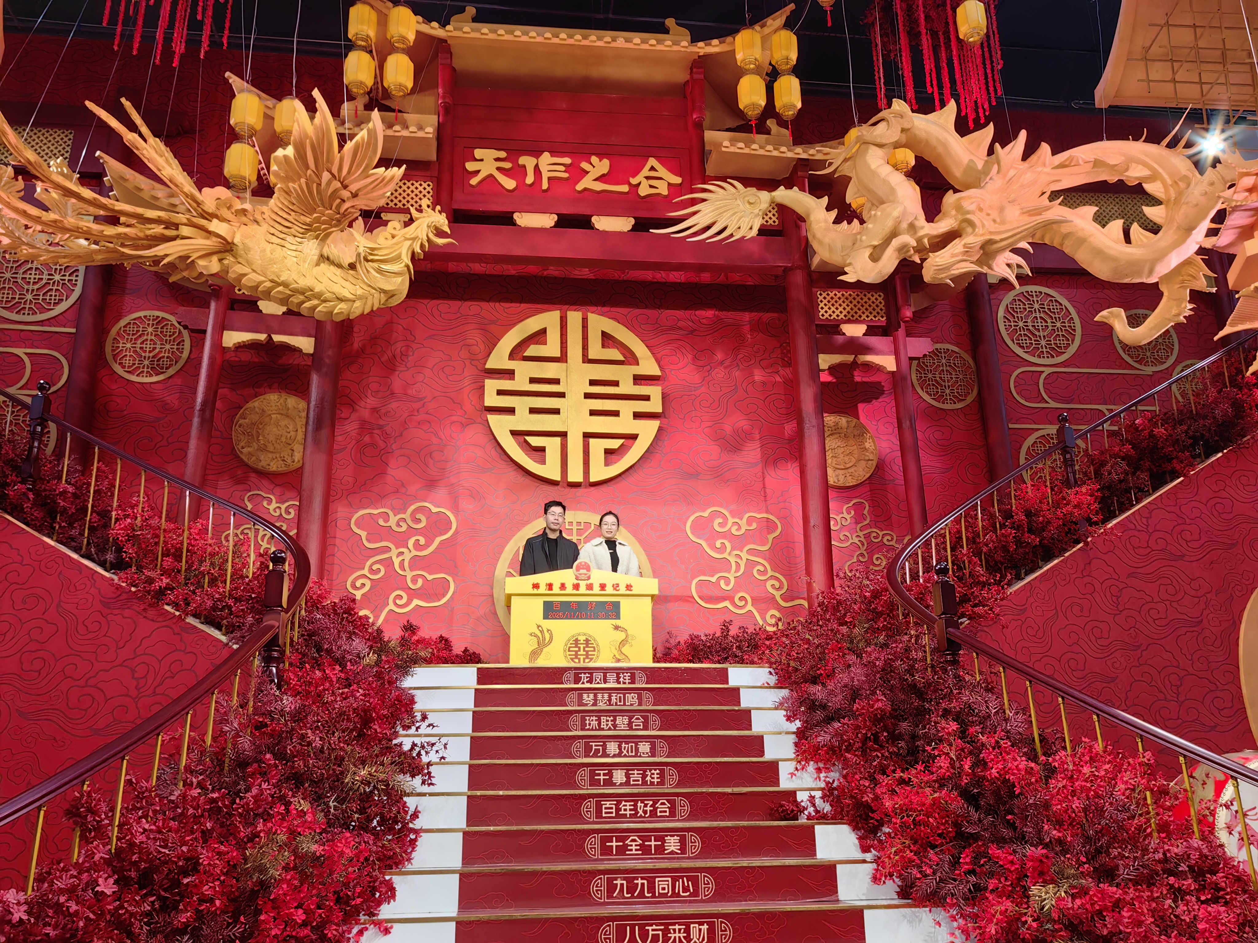 在婚姻登记处大厅的正中央,也是该大厅的亮点。十六层台阶上的婚姻见证台,两侧用朱红色的花卉点缀,空中悬挂着灯状装饰物,环绕在巨大的“囍”字周围。婚姻见证台的正上方,悬挂着龙凤呈祥浮雕。