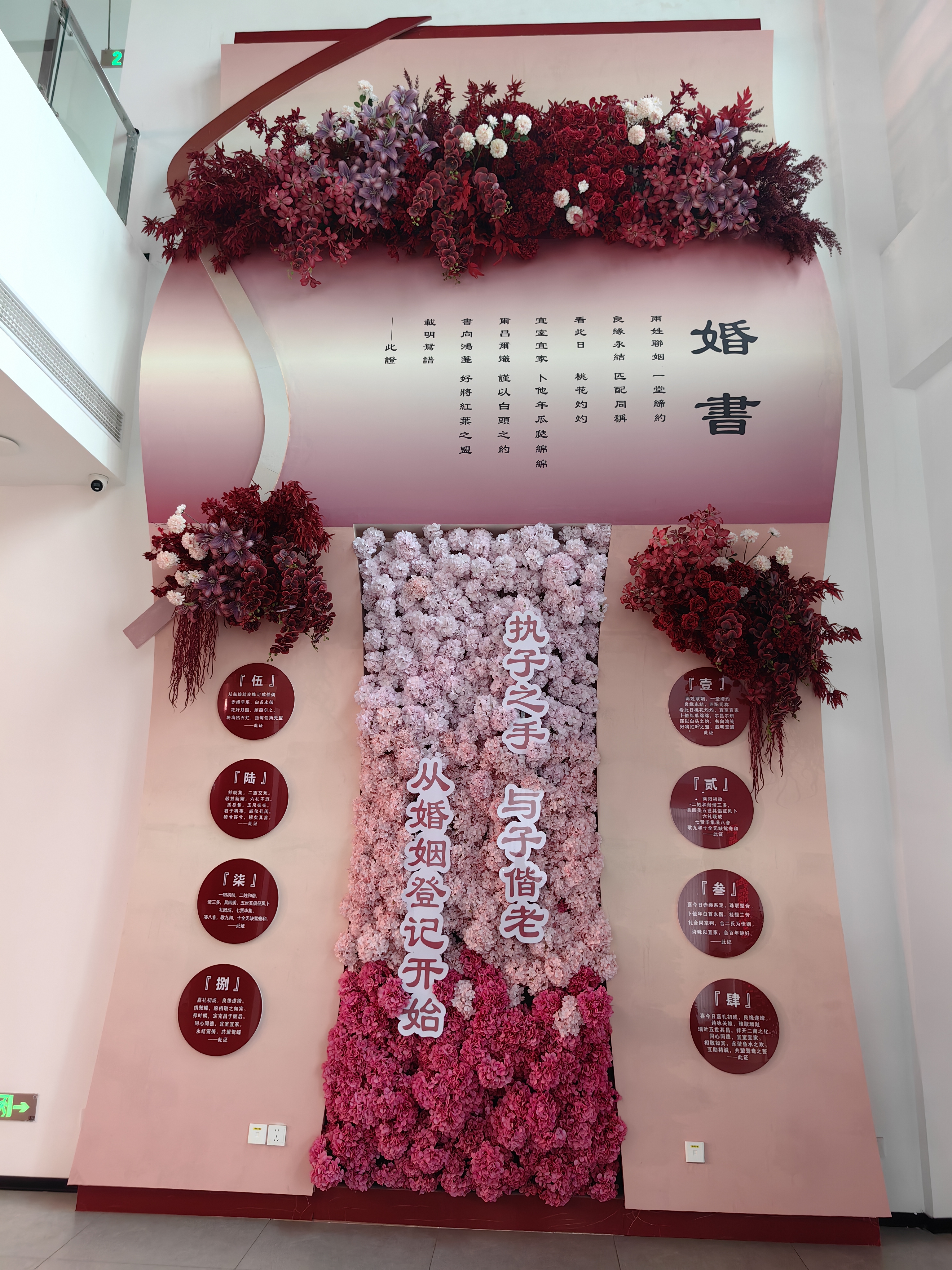 走进婚姻登记处大厅,侧面的墙壁上是各种花卉点缀的婚书,上书“执子之手 与子偕老”的爱情祝福。而在婚书的上方,写有“两姓联姻 一堂缔约 良缘永结 匹配同称……”的中式婚嫁誓言,仅婚书就充满着厚重的文化气息。
